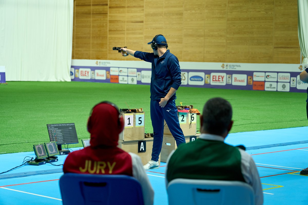In the 25m Rapid Fire Pistol Men Junior final, France dominated the podium, with Arnaud Gamaleri taking gold with 29 hits.